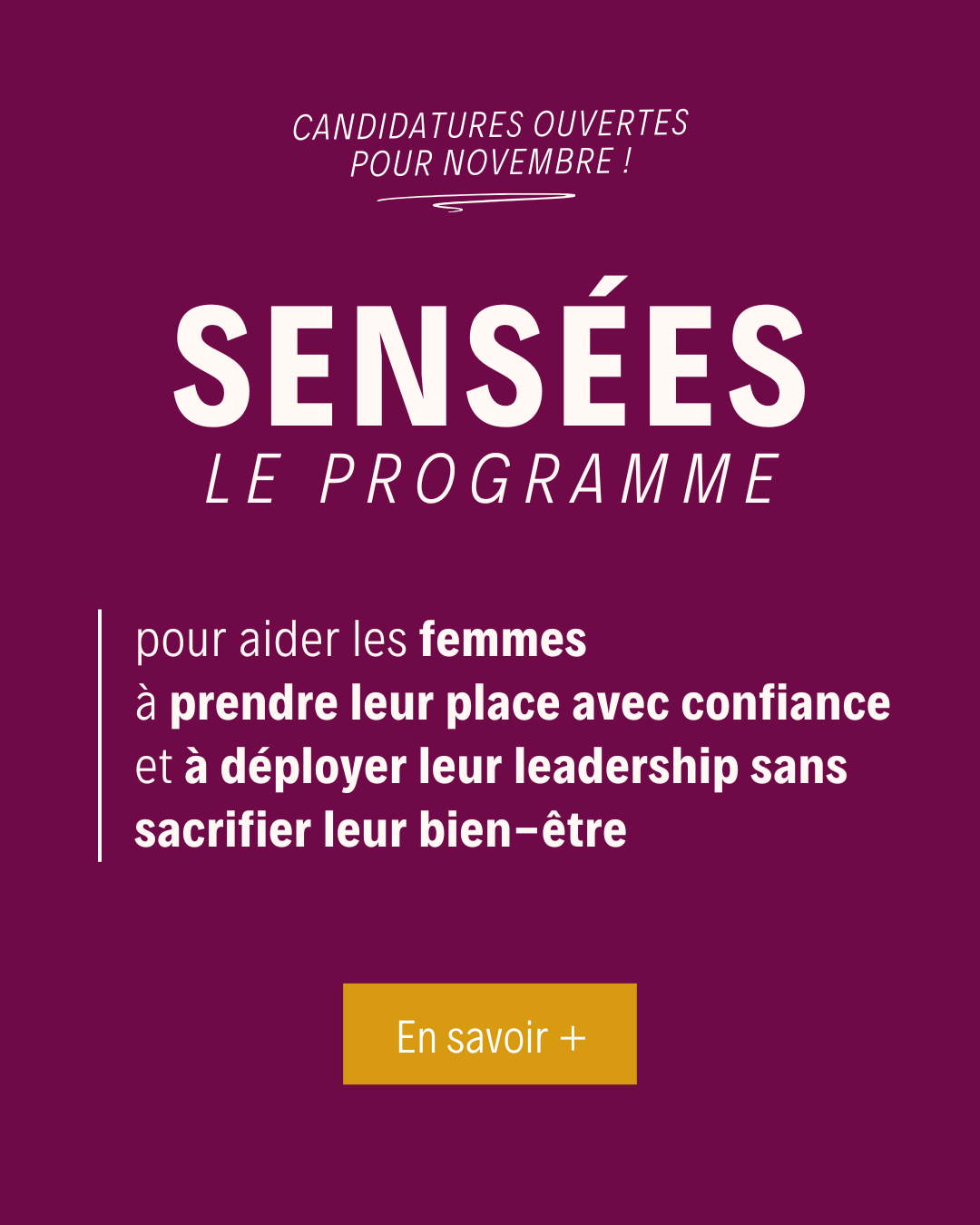 Notre programme signature Sensées est destiné aux femmes qui veulent prendre leur place avec confiance et déployer leur leadership sans sacrifier leur bien-être. Nous constituons actuellement le groupe de femmes qui démarre l’accompagnement en novembre 2025 !